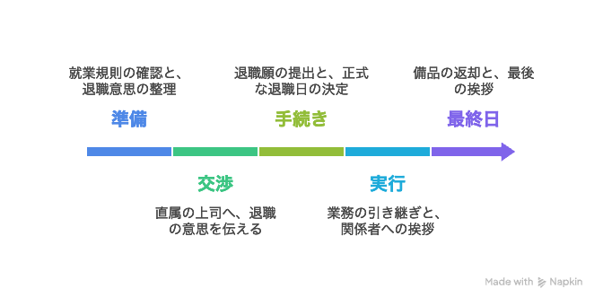 この段階を疎かにすると、いざ上司を前にした時に言葉に詰まったり、予期せぬルール違反を指摘されたりして、スムーズな退職が遠のいてしまいます。